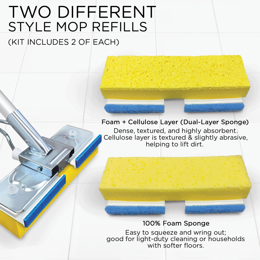 ➤ EASY CLEAN - Kit Includes 1 Sponge Mop and 4 Sponge Mop Heads- 2 Foam w/ Cellulose Layer and 2 Foam, very absorbent and clean fast. Scuff remover scrubber strips remove scuff marks, and ground in dirt, and debris. Easy one-step butterfly wringer makes cleaning hands-free and super easy.